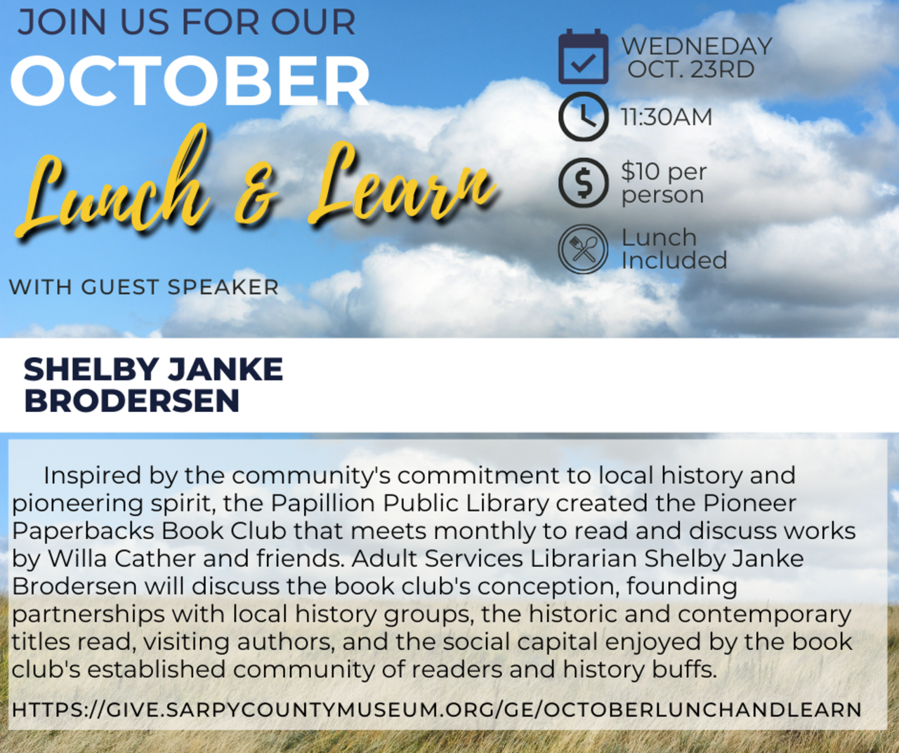 The October Lunch and Learn will take place on October 23rd at 11:30 a.m. at the Sarpy County Museum.Please email kori.rose@sarpymuseum.org with any questions.